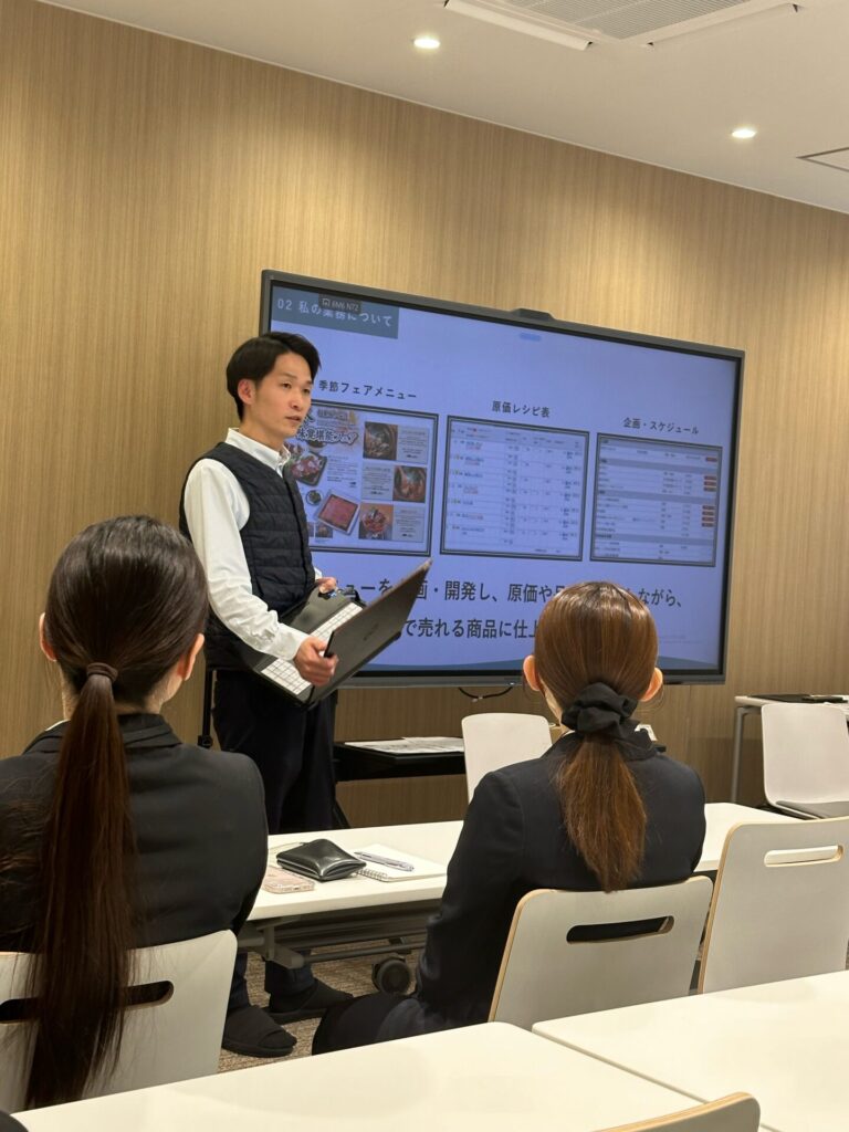 今回の研修では、飲食部門の商品開発を担当している河野(コウノ)さんが登壇!